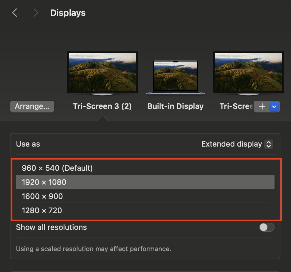 3. Select the screen you want to adjust and choose your preferred resolution. I personally use 1920 × 1080, but you can experiment to see what works best for you.
